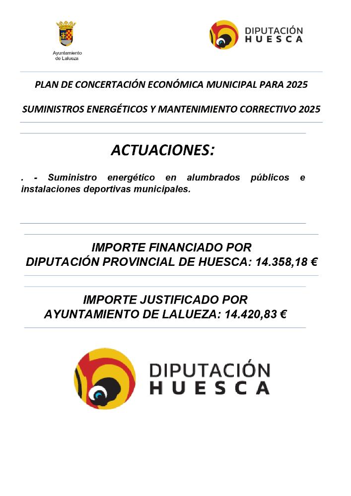 Plan de Concertación Económica Municipal 2025. Whatsapp: Plan de Concertación Económica Municipal 2025. Fecha 09 septiembre 2025 Suministros energéticos y mantenimiento correctivo. Subvención concedida por la Diputación Provincial de Huesca. Galería imágenes